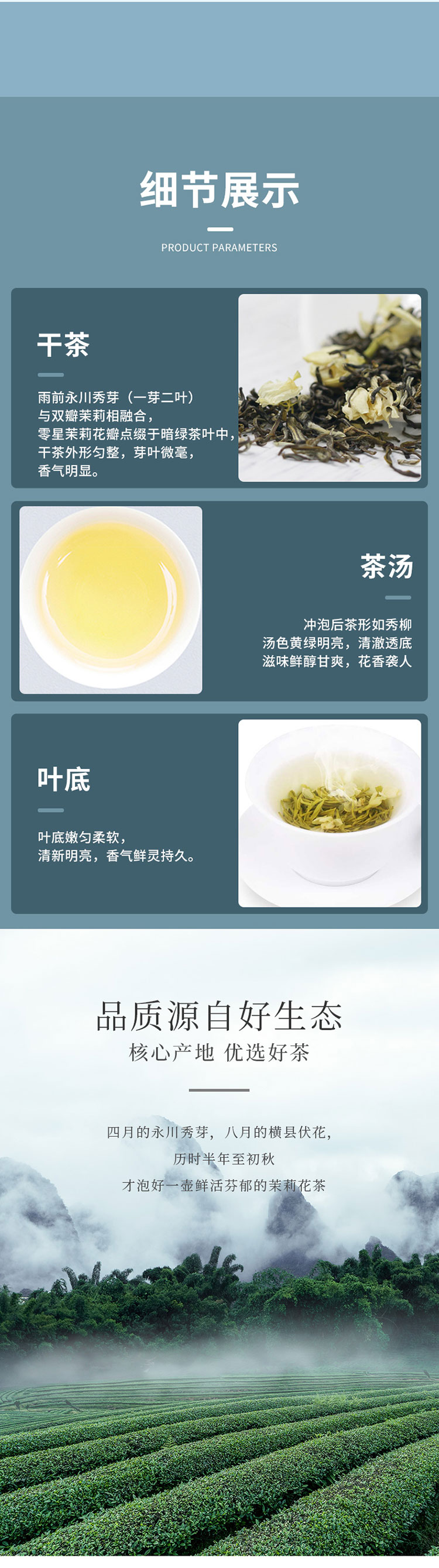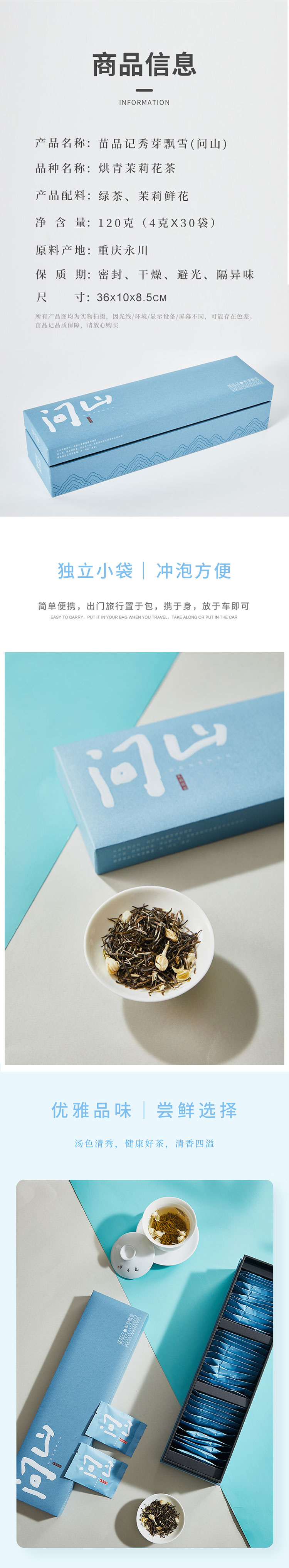 渝派茉莉花茶,苗品记秀芽白甄选重庆永川茶山竹海的优质茶青原料与福建福鼎的高山白茶原料进行科学拼配,采用现代白茶制作工艺和传统工艺相结合的方式精制而成,苗品记秀芽白突显了永川白茶的鲜和福鼎白茶的醇,并通过独有的白茶轻发酵工艺,让本品能够长期存放,并具有越存越香的特点。