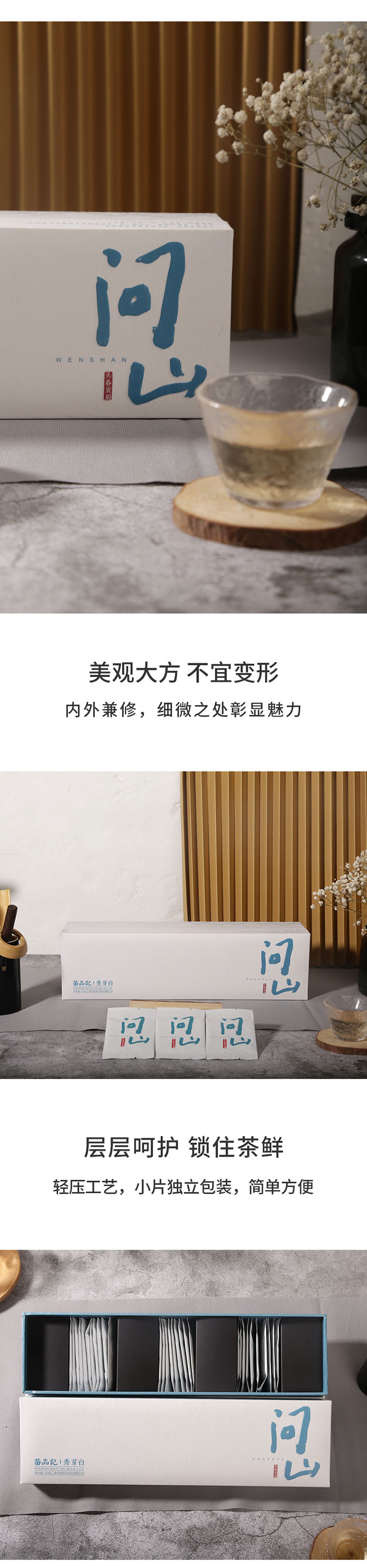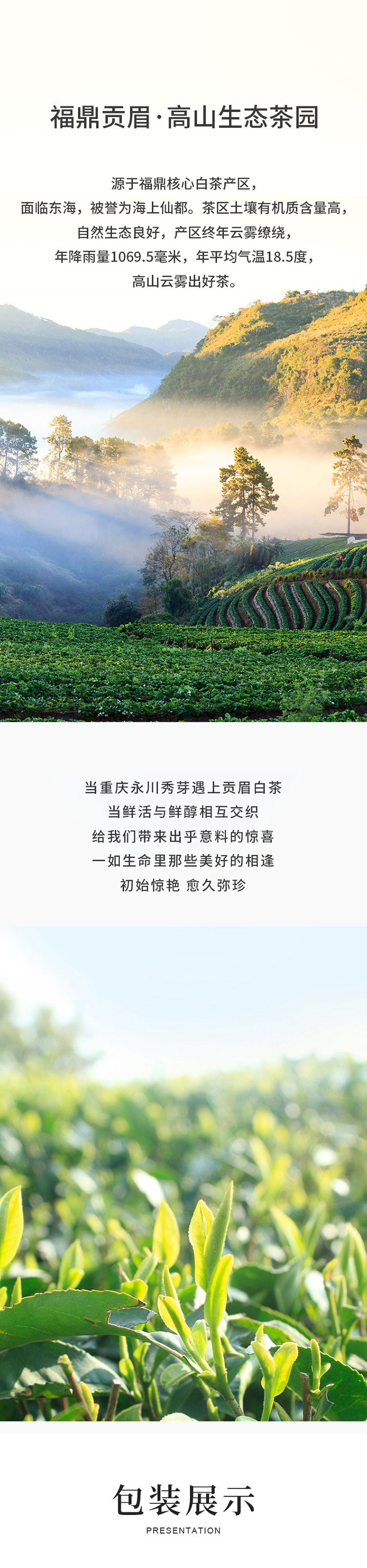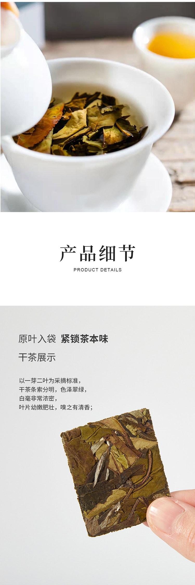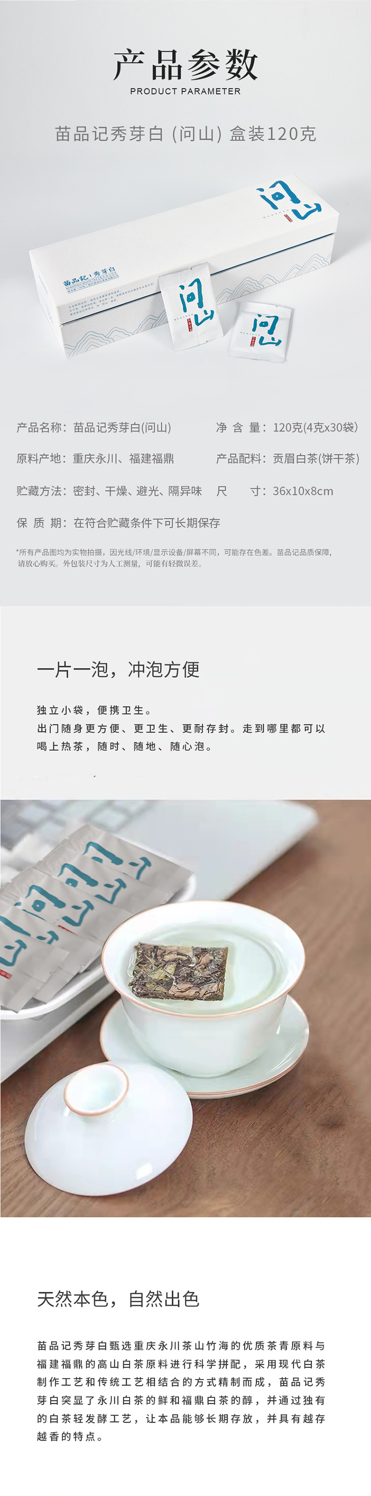 白毫银针,苗品记秀芽白甄选重庆永川茶山竹海的优质茶青原料与福建福鼎的高山白茶原料进行科学拼配,采用现代白茶制作工艺和传统工艺相结合的方式精制而成,苗品记秀芽白突显了永川白茶的鲜和福鼎白茶的醇,并通过独有的白茶轻发酵工艺,让本品能够长期存放,并具有越存越香的特点。