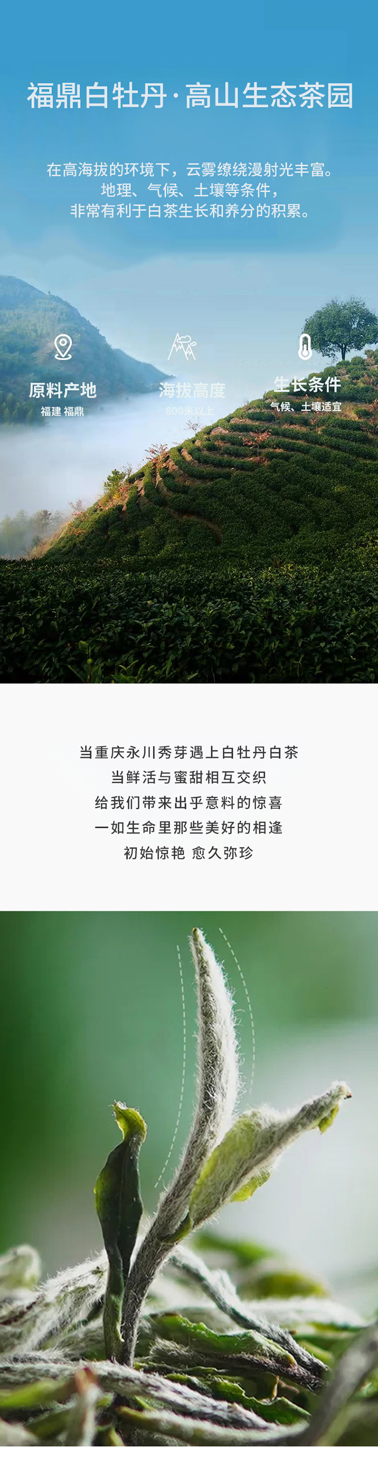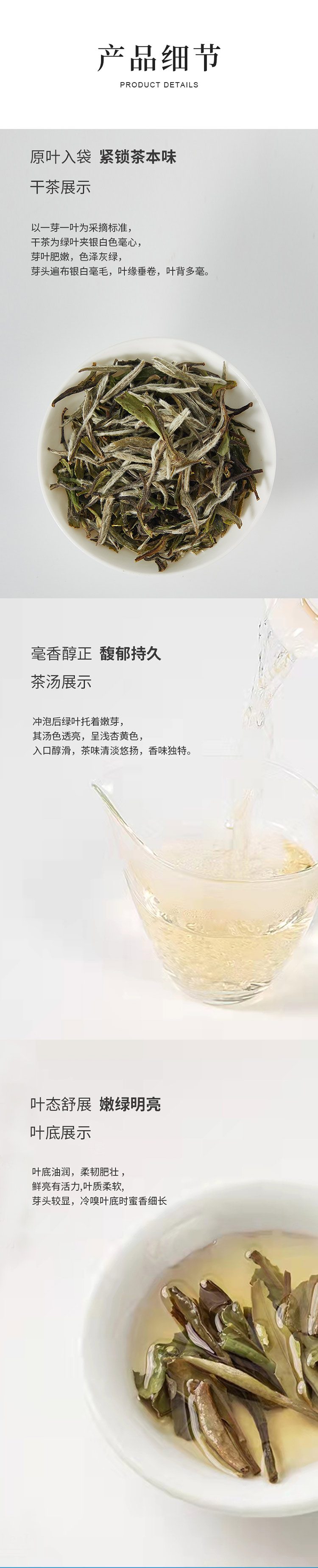 白毫银针,苗品记秀芽白甄选重庆永川茶山竹海的优质茶青原料与福建福鼎的高山白茶原料进行科学拼配,采用现代白茶制作工艺和传统工艺相结合的方式精制而成,苗品记秀芽白突显了永川白茶的鲜和福鼎白茶的醇,并通过独有的白茶轻发酵工艺,让本品能够长期存放,并具有越存越香的特点。